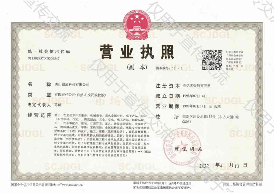 | 1998年 注册于河北省唐山市高新技术开发区 |